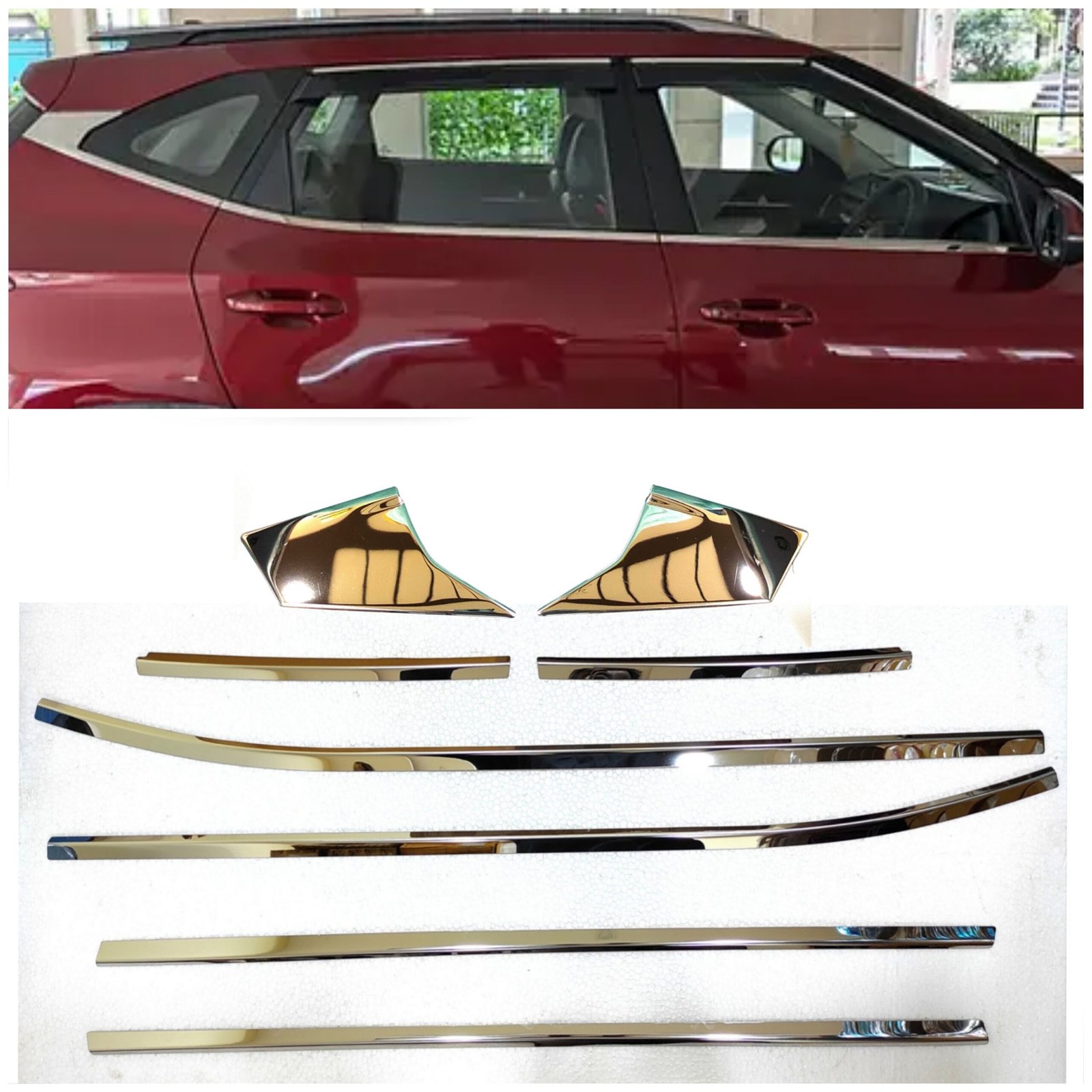 A: This complete exterior styling kit includes 8 pieces in total: 6 sleek chrome strips for the lower window frames of all four doors, and 2 specifically designed chrome panels for the rear quarter glass (C-pillar area) to complete the premium look.