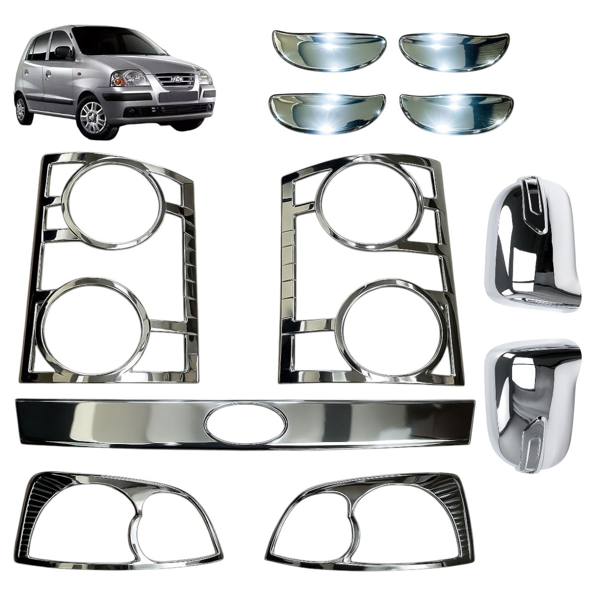 Chrome Combo Kit for Santro Xing – Premium Exterior Styling (11Pcs) | Headlight, Tail Light, Mirror, Handle, Number Plate Garnish