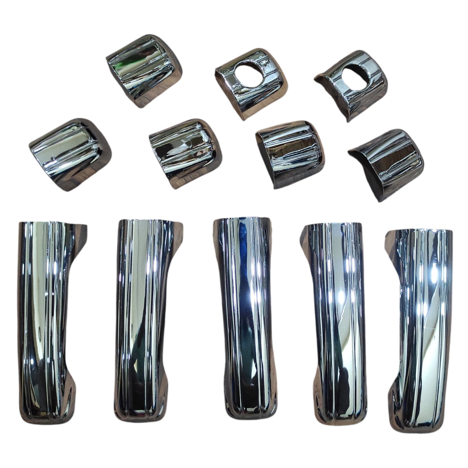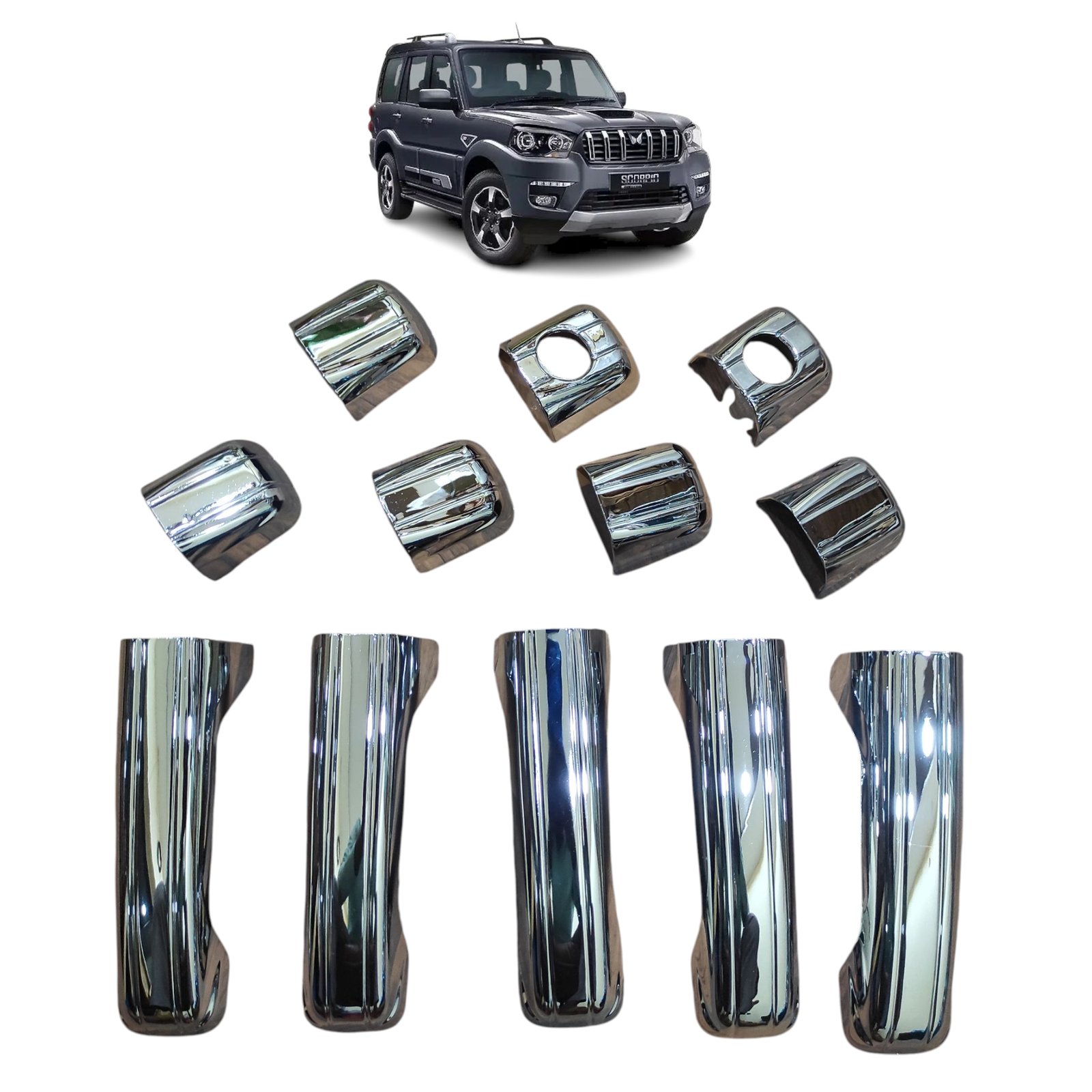 Enhance the exterior styling of your Scorpio (2014-2020) with this set of 12 premium chrome door handle catch covers. Crafted from high-quality ABS plastic with a durable triple-layer chrome finish, these covers provide a stylish, shiny look while protecting your original door handles from scratches and wear. Designed for a perfect fit, these easy-to-install covers come with pre-applied adhesive, requiring no drilling or modifications. Ideal for automotive exterior styling accessories to elevate your vehicle’s appearance with a sleek chrome touch.