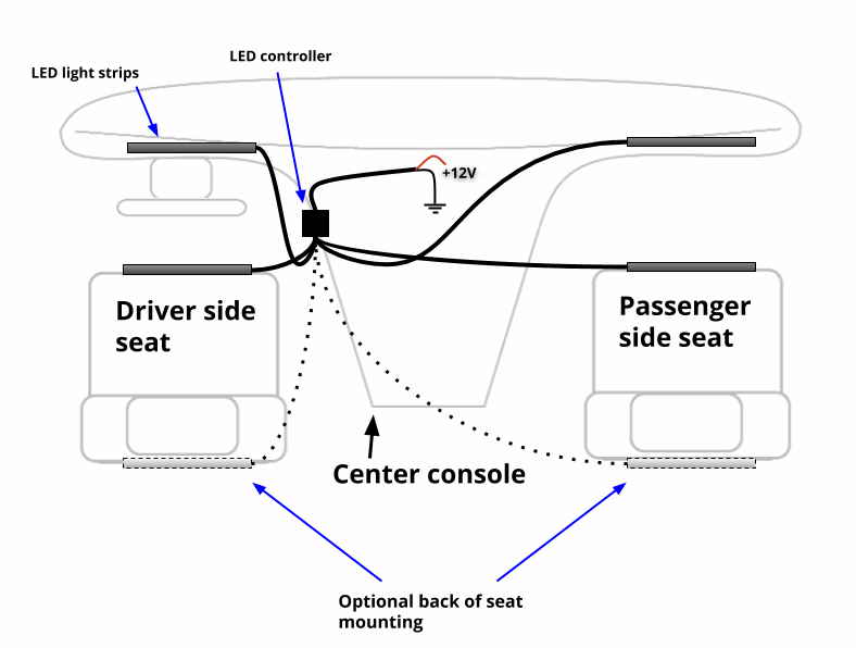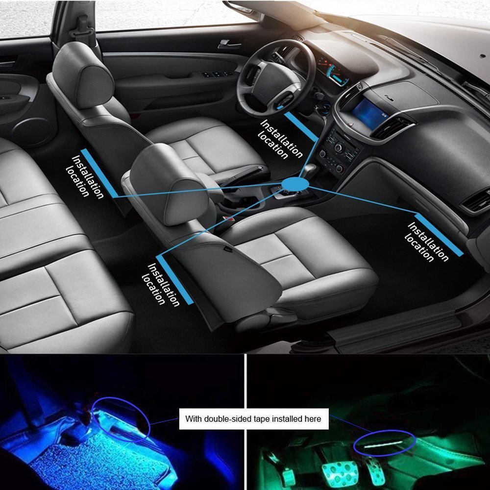 - Use the included adhesive tape to attach the LED strips under your car’s dashboard or other interior areas.